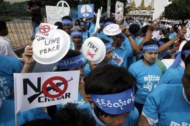 Kachin-Angehörige, Künstler und Mitglieder von Bürgerbewegungen gingen am Freitag in der burmesischen Stadt auf die Strasse. Viele Teilnehmer trugen blaue T-Shirts mit der Aufschrift „Stoppt den Bürgerkrieg“. Der Demonstrationszug führte durch mehrere Stadtteile der Wirtschaftsmetropole.