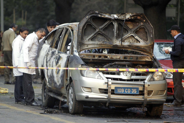 Ein Diplomatenauto ging nach der Explosion in Flammen auf. Bei dem Attentat wurden die Ehefrau des Militärattachés der Botschaft sowie drei weitere Menschen verletzt. Nach Angaben der indischen Polizei war die 42-jährige Frau bei Bewusstsein und schwebte nicht in Lebensgefahr.