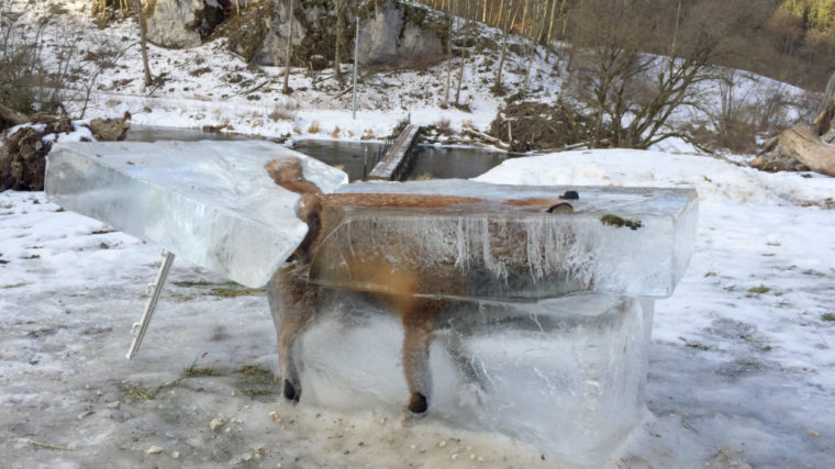 Als Warnung vor gefährlichen Eisflächen hat ein Jäger im deutschen Bundesland Baden-Württemberg einen tiefgefrorenen Fuchs ausgestellt. Das Tier sei ins Eis der Donau eingebrochen, ertrunken und dann eingefroren, berichtete Franz Stehle der Nachrichtenagentur dpa.