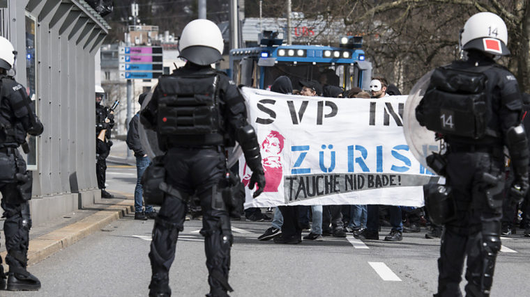 Während rund 1000 Personen am Sonntag im Zürcher Kongresshaus das 100-Jahr-Jubiläum der Zürcher SVP feierten, sicherte die Polizei die Umgebung mit einem Grossaufgebot. Am Nachmittag verhaftete die Polizei rund 100 Demonstranten, welche die Feier stören wollten.