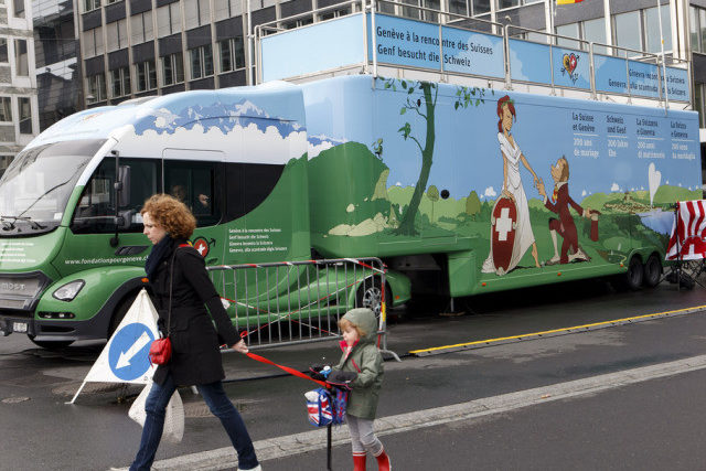 Der Sattelschlepper wird bis am 27. Juni in 43 Städten in allen Kantonen auf zentralen Plätzen Stationen machen. Interessierte können an neun Ständen Stadt und Kanton Genf näher kennenlernen. Erstmals macht die Karawane aus Genf am Montag auf dem Bundesplatz in Bern Halt.