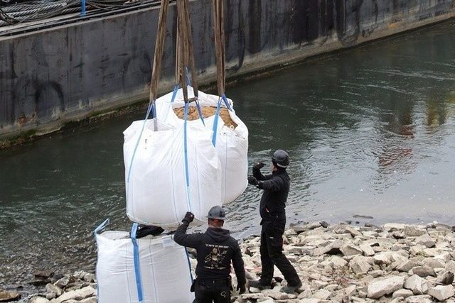 „Big Bags“ sind grosse Sandsäcke, die jeweils eine Tonne wiegen. Mit rund 350 Stück dieser Säcke soll ein Kreis um die Bombe gelegt werden, aus dem das Wasser abgepumpt wird.