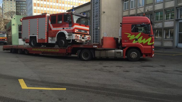 In Lausanne ist am Dienstag ein ausgedientes Tanklöschfahrzeug der Feuerwehr auf einen Lastwagen geladen und abtransportiert worden. Das Fahrzeug wird nach Belgien gebracht und von dort in die chilenische Hafenstadt Valparaiso verschifft.