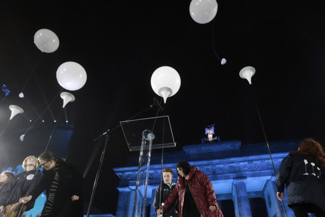 Mit einer Ballonaktion haben die Feiern zum 25. Jahrestag des Mauerfalls am Sonntagabend ihren Höhepunkt erreicht. Am Brandenburger Tor begannen freiwillige Helfer damit, die an der früheren Grenze aufgestellten leuchtenden Ballons in die Luft steigen zu lassen.