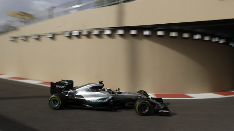 Auf dem 5,554 km langen Yas Marina Circuit in Abu Dhabi fuhr Hamilton in der ersten Session bei knapp 30 Grad trotz eines Drehers in der ersten halben Stunde seine schnellste Runde auf Soft-Reifen. Rosberg erzielte seine Bestzeit mit den schnelleren Ultrasoft-Pneus und verlor trotzdem 0,374 Sekunden Vorsprung.