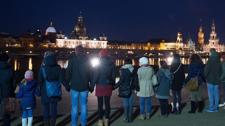 Unter dem Geläut der Kirchenglocken verband die Menschenkette am Samstagabend beide Seiten der Elbe. Dresden macht heute vor allem durch die fremdenfeindliche Pegida-Bewegung Schlagzeilen.