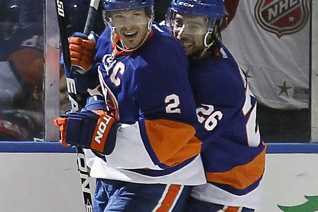 Mark Streit, der Captain der New York Islanders, markiert das Tor zum 2:1-Overtime-Sieg gegen die Los Angeles Kings.