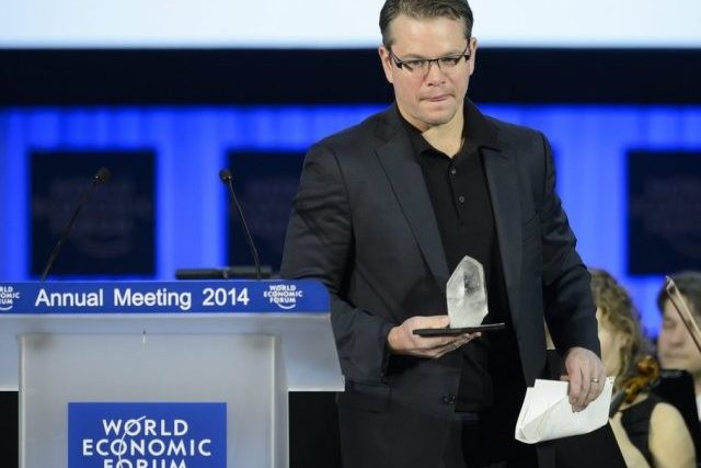 Damon nahm die Auszeichnung von Hilde Schwab, Ehefrau von WEF-Gründer Klaus Schwab, entgegen. Dann machte er sich – auf humoristische Weise – über die Küsschen lustig, die der irische Sänger und WEF-Dauergast Bono ihm offenbar auf theatralische Art bei seiner Ankunft in Davos von Weitem zugeschickt hatte.
