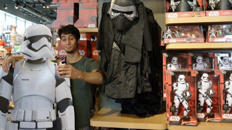 In einem Metallkasten an den Kassen türmen sich Plastiklaserschwerter. Jedes davon kostet 22,99 Dollar, ein Schnäppchen im Vergleich zur Edelversion in Rot oder Grün zwei Regale weiter für 173,99 Dollar. Drumherum stehen, liegen und hängen Handschuhe, Kappen, Plastikraumschiffe, sprechende Yoda-Köpfe und hüfthohe Darth Vaders, die auf Knopfdruck gruselige Geräusche machen.