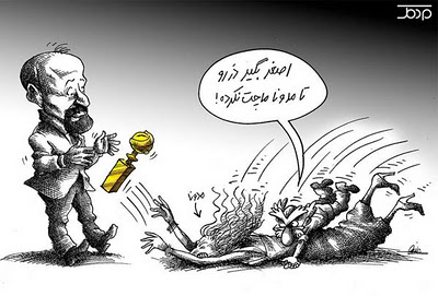Gespannt erwartete man von Farhadi ein Statment zu seinem Land. Er sagte aber nur, er denke an seine Familie im Iran. Und an sein Volk, das wirklich ein sehr friedliebendes Volk sei. Mehr war an Andeutung über seine Situation als Künstler nicht zu hören. Er machte damit klar, wie dünn das Eis für jene Iraner ist, die nicht Propaganda der offiziellen Politik vertreten. Wie angespannt die Situation für diesen friedliebenden Teil des Volkes ist, der stumm bleiben muss, ist, spiegelten auch die Karikaturen wieder: