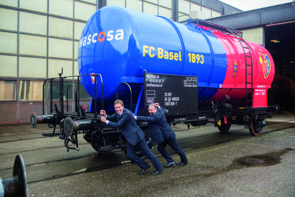 Und weiter geht’s auf die Schiene. Dort hat die Firma Wascosa (achtung, Wortwitz) zügig auf den vierten Meistertitel des FCB in Serie reagiert und einen Kesselwagen in Rot und Blau gestrichen. FCB-Vizepräsident Adrian Knup war vor Ort und erklärte: «Das ist ein schöner Ersatz für unseren FCB-Rennwagen.» Und wer vermisst ihn nicht, den FCB-Rennwagen?