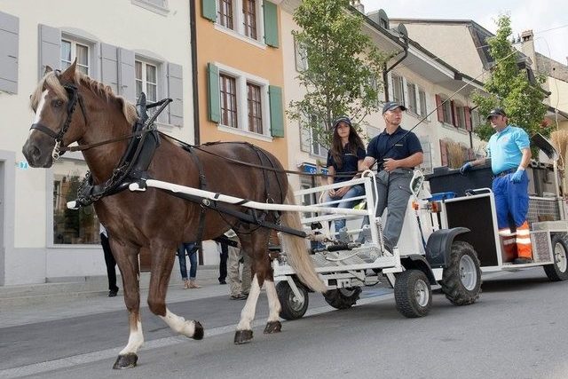In Avenches wird seit Anfang August die E-Kutsche bereits eingesetzt: Laut Meterus werden drei Mal wöchentlich die öffentlichen Abfallkübel geleert. Ausserdem findet an jedem ungeraden Montag im Monat die Altpapiersammlung neu nun per Pferd und E-Kutsche statt.
