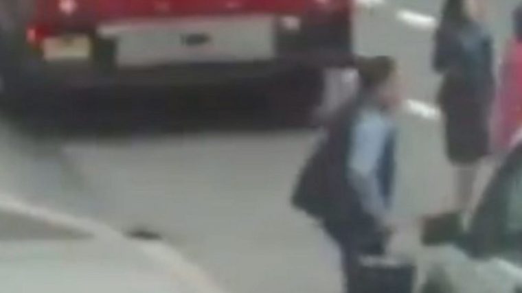 Auf den Videoaufnahmen ist zu sehen, wie der Mann den Eimer zunächst mit zwei Händen, dann mit einer Hand packt. Er hält einen Augenblick inne, setzt den Eimer kurz ab. Dann greift er den Henkel des Eimers, überquert die Third Avenue und verschwindet.