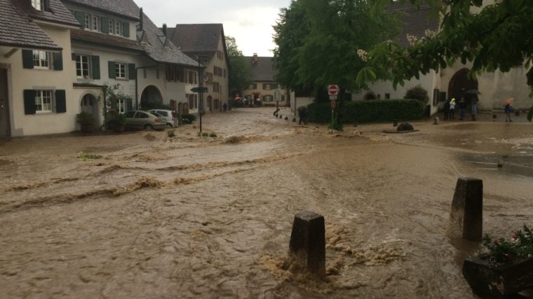 Nach den anhaltenden Regenfällen der vergangenen Tage war eine sehr aktive Gewitterzelle, die zwischen halb sechs und acht Uhr am Abend ostwärts über Muttenz und Pratteln zog, zu viel: In diesen zweieinhalb Stunden fielen dort laut Polizei rund 28 Millimeter Regen. Die bereits völlig durchnässten Böden konnten das Wasser nicht mehr aufnehmen. In Muttenz, am Fuss des Wartenbergs, regnete es wie aus Kübeln; zudem fiel zeitweise Hagel. Teils wegen verstopfter Rechen verliess das Wasser unter anderem den Rietmattbach und lief auf Strassen abwärts. Besonders betroffen war das Oberdorf – die historische Kirche St. Arbogast mit ihrer Ringmauer im Dorfzentrum sah fast wie ein Wasserschloss aus.