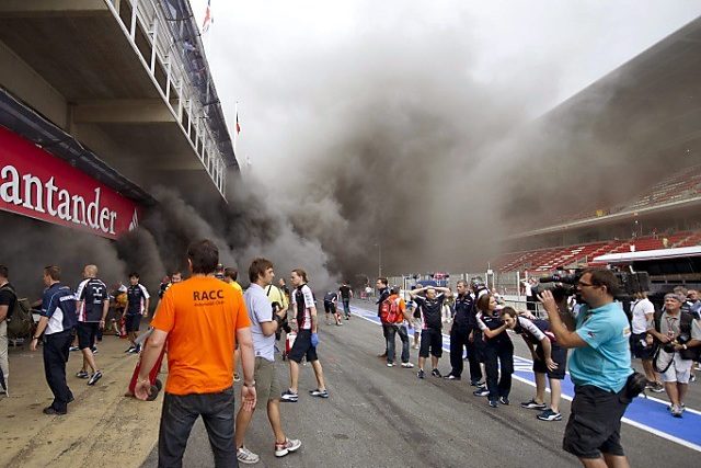 Nach dem Sensationssieg von Pastor Maldonado beim Grand Prix von Spanien bricht in der Box von Williams-Renault ein Feuer aus. Als Brandursache wird eine Kers-Batterie vermutet, die Funken schlug.