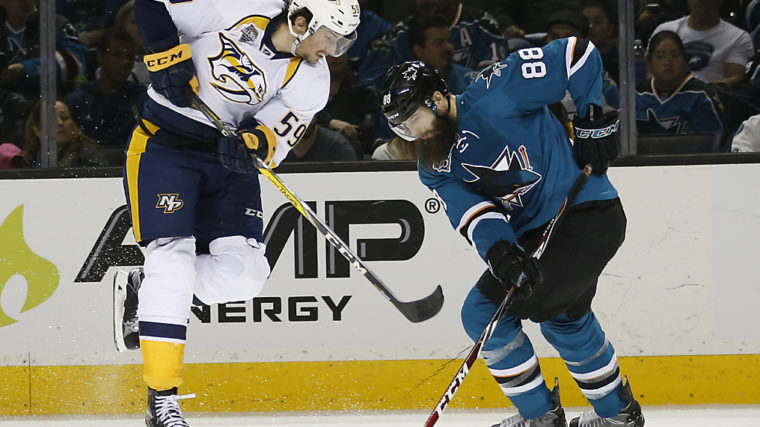 Im zweiten Spiel fielen vier der fünf Tore erst ab der 53. Minute. Zunächst leistete der Berner Verteidiger Josi die Vorarbeit zum 1:1-Ausgleich von Mattias Ekholm. Nach San Joses neuerlicher Führung durch Joe Pavelskis sechsten Treffer in den Playoffs fielen die letzten beiden Tore in der 60. Minute. Der frühere Davoser Joe Thornton stellte den Sieg mit einem Schuss ins leere Tor zum 3:1 praktisch sicher. Der Anschluss durch Ryan Johansen, vorbereitet erneut von Josi, fiel erst vier Sekunden vor der Schlusssirene.