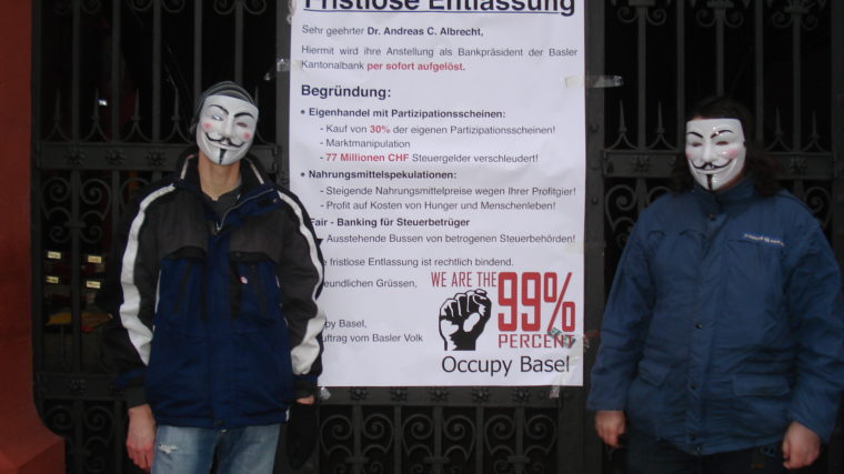 Mit der heutigen Aktion vor dem Rathaus fordert Occupy Basel weitgehende Konsequenzen nach diesem Skandal. Dazu wurde dem Bankpräsidenten, Dr. Andreas C. Albrecht, per Mitteilung in Riesenformat seine sofortige Entlassung mitgeteilt. Da der dafür zuständige Regierungsrat seine Verpflichtung in der Sache wiederholt nicht wahrnimmt, wurde in dessen Vertretung dieser direkte Weg gewählt. Es erklärt sich von selbst, dass sich diese personellen Konsequenzen nicht auf den Bankpräsidenten beschränken dürfen, sondern auch die verantwortlichen Personen im Bankrat, der Regierung sowie der restlichen Geschäftsleitung der Basler Kantonalbank betreffen müssen.