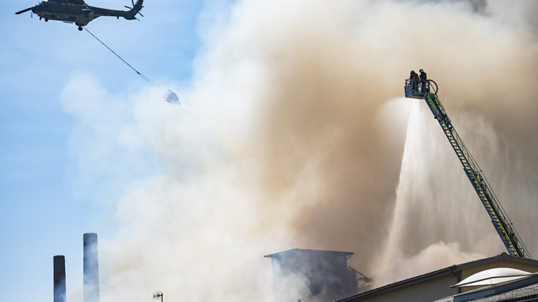 Kurz vor 5.30 Uhr hatte ein Mitarbeiter eine starke Rauchentwicklung aus einer der Lagerhallen bemerkt und Alarm geschlagen. Beim Eintreffen der Feuerwehr schlugen bereits Flammen aus dem Dach des Gebäudes auf dem Raduner-Areal. Über 100 Feuerwehrleute und zwei Armeehelikopter stehen seither im Einsatz.