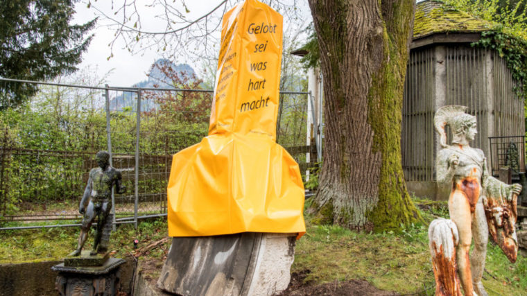 Der Streit um eine Phallus-Skulptur am Rand eines Pilgerwegs in Österreich ist entschärft worden. Die mehr als zwei Meter hohe Skulptur wurde mit einer gelben Folie verhüllt, die entfernt an ein Kondom erinnert. Aufschrift: «Gelobt sei, was hart macht».