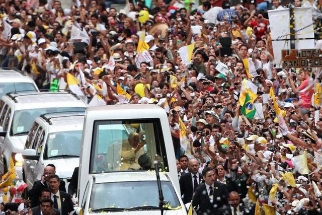 Die Menschen drängten sich in den engen Strassen der alten Silberminenstadt. Von den Balkonen der Häuser liessen sie Lametta auf die Papstkolonne niederregnen. Im Anschluss an den Höflichkeitsbesuch bei Calderón traf Benedikt mit 1800 Kindern zusammen.