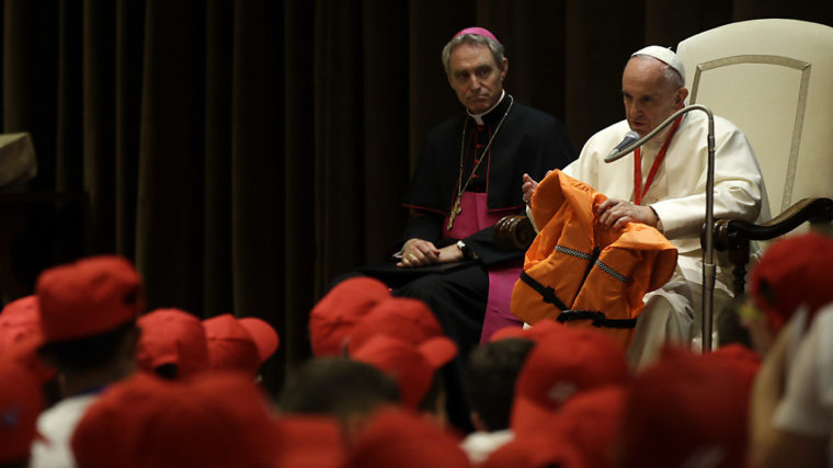 Beim Treffen im Vatikan am Samstag hielt der Papst eine orangefarbene Rettungsweste, die ein im Meer ertrunkenes Mädchen getragen hatte. Ein Helfer hatte sie ihm vor wenigen Tagen bei einer Generalaudienz gegeben und geweint, weil er das Kind nicht retten konnte.