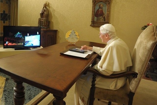 Mit einem modernen Tablet-Computer hat Papst Benedikt XVI. aus 230 Kilometern Entfernung die Lichter am grössten „Weihnachtsbaum“ der Welt angezündet.