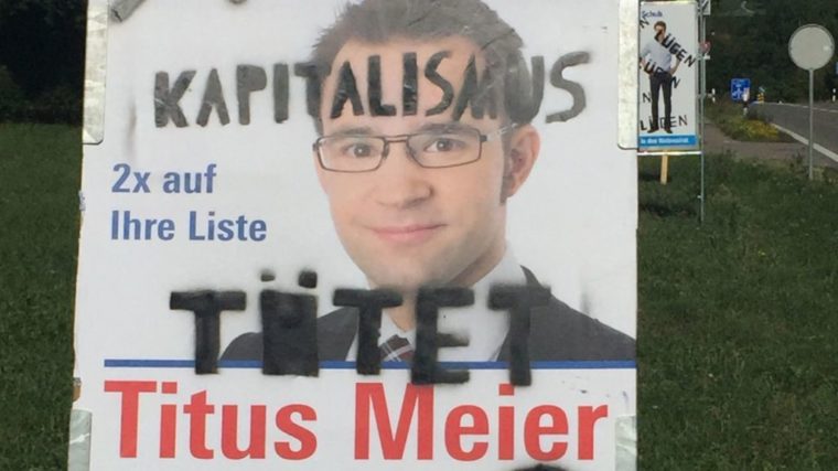 «Kapitalismus tötet» und «Egoist» steht auf dem Wahlplakat von Titus Meier von der FDP. Die Plakate der Partei wurden in Brugg AG systematisch mit schwarzer Farbe besprayt. «Das war eine geplante Aktion», sagte Meier. Die Täter hätten vorgefertigte Schablonen verwendet.