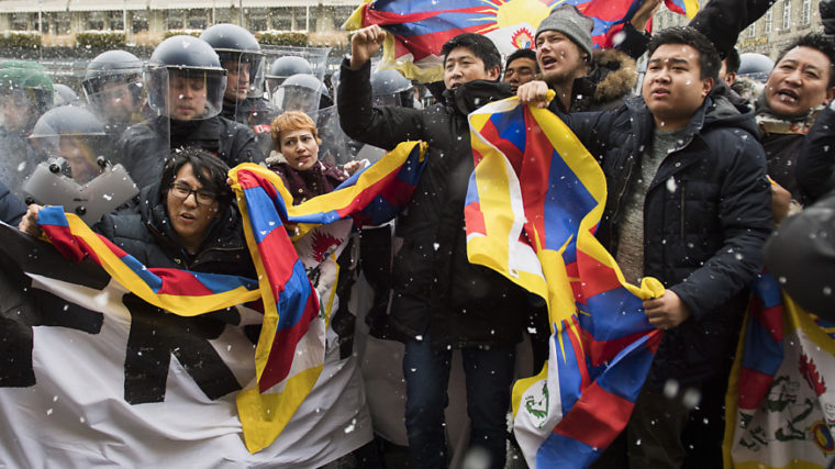 Die Teilnehmer der bewilligten Kundgebung vom Morgen forderten mehr Menschenrechte in Tibet und den Start eines Dialogs zwischen der chinesischen Regierung und dem Dalai Lama. «Xi Jinping: Stopp Folter in Tibet» und «Bringen wir Schweizer Demokratie nach Tibet und China» stand unter anderem auf den Transparenten der Demonstranten auf dem Unteren Waisenhausplatz.