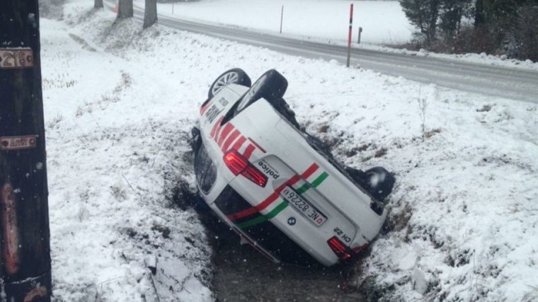 Ein Polizeiauto ist am Sonntag auf dem Weg zu Unfallopfern auf dem Col de la Tourne im Kanton Neuenburg von der verschneiten Strasse abgekommen und auf dem Dach gelandet. Der Lenker des Streifenwagens erlitt Schnittwunden am Gesicht.