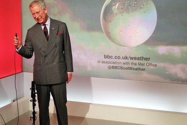Der Prinz reicherte diese dabei mit ein paar persönlichen Sprüchen an. „Gott sei Dank ist morgen kein Feiertag“, sagte Charles mit Blick auf das von ihm vorhergesagte schlechte Wetter mit Wind und Regen in Schottland und zeigte dabei auf die Wetterkarte hinter sich.