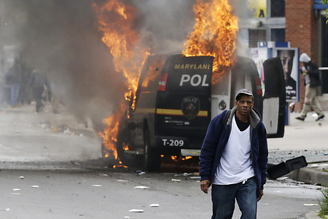 Der TV-Sender CNN zeigte Bilder von Plünderern, die in Baltimore mit vollgepackten Plastiktüten aus Geschäften stürmten. Autos wurden in Brand gesetzt. TV-Kommentatoren meinten, offensichtlich sei die Polizei überfordert gewesen. Die Unruhen brachen den Angaben zufolge an mehreren Orten der Stadt aus.