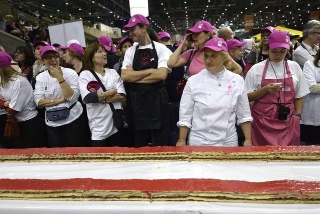 An der gigantischen Schnitte arbeiteten 25 Konditoren unterstützt von Freiwilligen – alles in allem rund 100 Leute. Die Kreation wog zum Schluss 4207 Kilo. An Zutaten wurden 864 Liter Crème, 576 Liter Milch, 600 Kilo Mehl, 432 Kilo Butter und 360 Kilo Schmelzmittel und anderes mehr verbraucht.