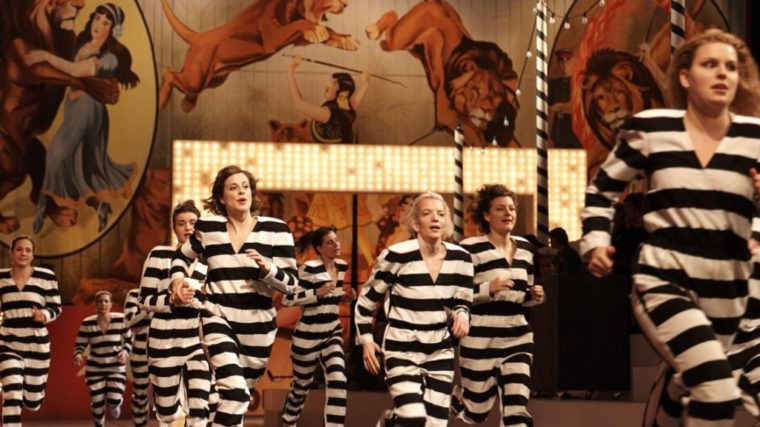 Gesprochen werden sie von einem vierköpfigen heftig getriebenen Ensemble (Hilke Altefrohne, Inga Busch, Marie Rosa Tietjen, Jirka Zett) und einem bewegungsfreudigen, synchron skandierenden 14-köpfigen Frauenchor, der als Resonanzkörper oder als Widerspruchsgesellschaft des Ensembles funktioniert.