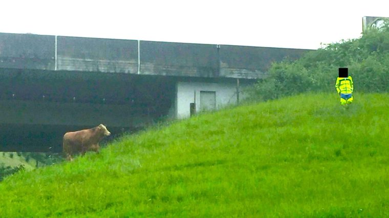 Eine Polizeipatrouille entdeckte das Tier später am Dorfausgang und versuchten es auf eine Wiese zu treiben. Im weiteren Verlauf flüchtete das Rind gemäss Mitteilung jedoch über die Gleise der SBB in Richtung kantonaler Autobahn A22.