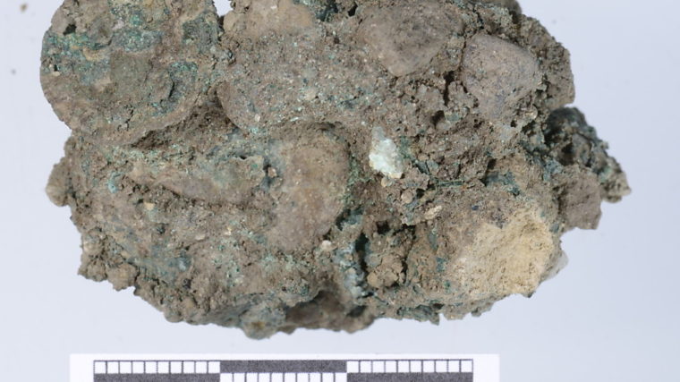 Bei dem unüblich bestatteten Skelett fanden sich zusammenkorrodierte Münzen. Der Münzklumpen war ursprünglich der Inhalt eines Geldbeutels, den der Mann auf seiner Brust trug. Das Leder der Börse hatte sich mit den Jahren zersetzt.