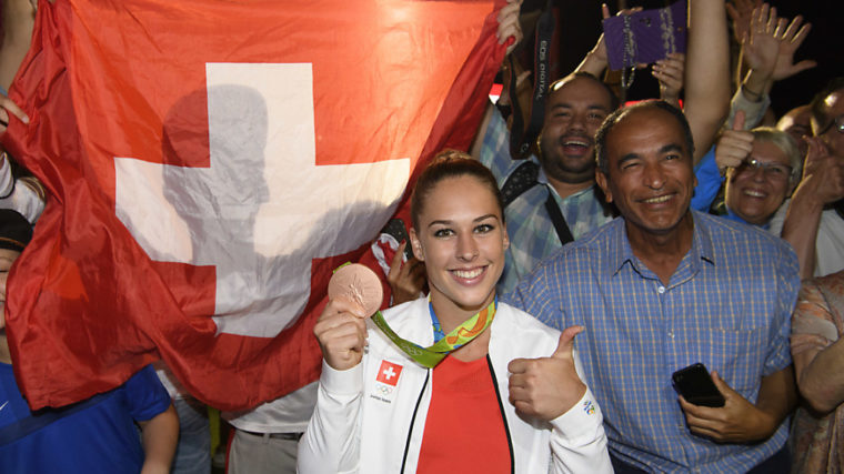 Nachdem sie allen Mikrofonen, Objektiven und Kameralinsen zum x-ten Mal etwas geboten hatte, durfte Giulia Steingruber das Bad in der Menge nehmen. Mit ihren 160 Zentimetern tauchte sie regelrecht ab, ganz im Unterschied zu der 190 Zentimeter Beachvolleyballerin Joana Heidrich, die mit der gleichen Maschine angekommen war. Die Baselbieterin ragte aus allen heraus.