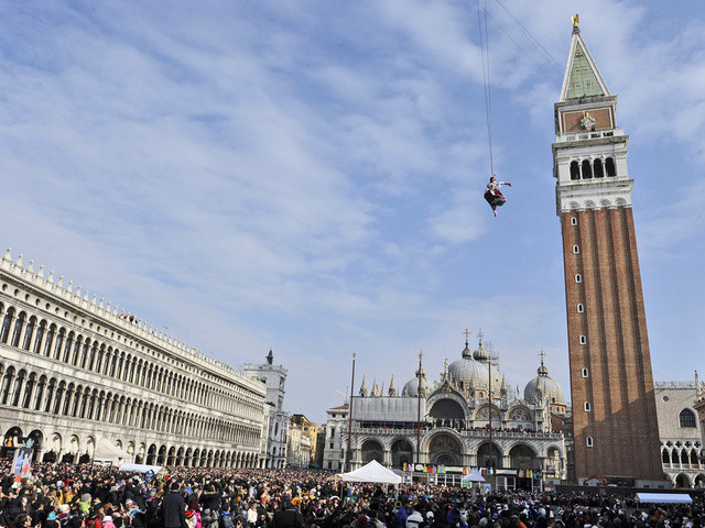 Eine junge Frau hat sich am Sonntag vom 99 Meter hohen Markusturm geschwungen und somit die heisse Phase des Karnevals in Venedig eingeläutet. Bekleidet mit einem roten Kostüm und befestigt an Sicherheitsseilen schwebte Giulia Selero zum Markusplatz hinab.