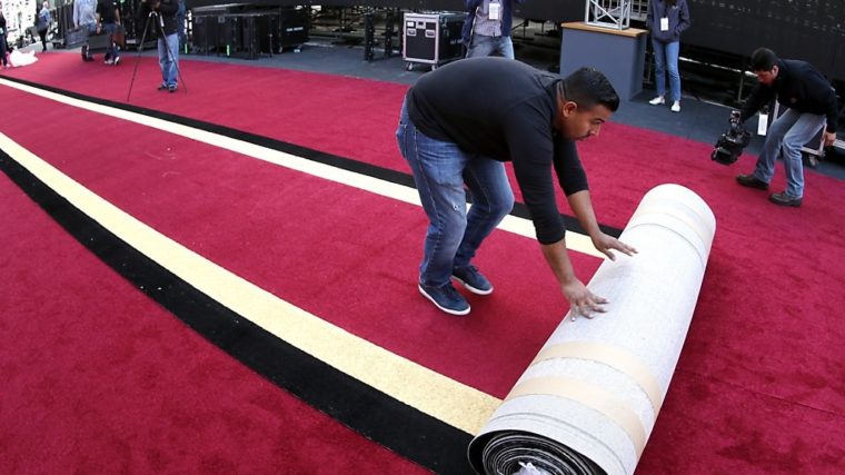 Knapp 300 Meter lang und gut zehn Meter breit, bedeckt der Teppich ein Stück des sonst stark befahrenen Hollywood Boulevards. Dutzende Helfer installieren den berühmten Teppich-Laufsteg, stutzen Kanten und verschweissen Nahtstellen.