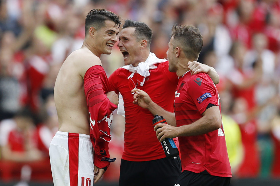 Trotz Niederlage hat Taulant Xhaka (Mitte) das Lachen nicht verlernt: Trikottausch mit seinem Bruder Granit (links), rechts steht Amir Abrashi.