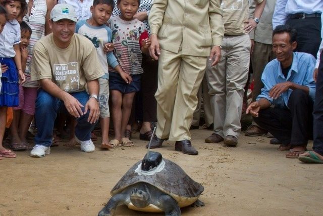 Ein mit einem Sender versehenes Exemplar der am stärksten bedrohten Schildkrötenart der Welt ist in einem Fluss in Kambodscha ausgewildert worden. Forscher wollen anhand der per Satellit übertragenen Daten das Verhalten des Tieres untersuchen.