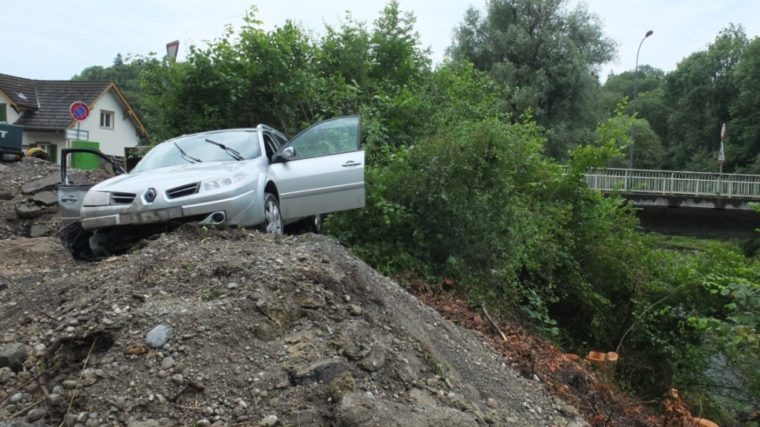 Das Auto kam in der Folge von der Strasse ab, prallte gegen einen Schutthaufen und streifte anschliessend einen Bagger. Erst unmittelbar vor einem Abhang blieb das Auto stehen, wie ein Foto der Polizei zeigt.