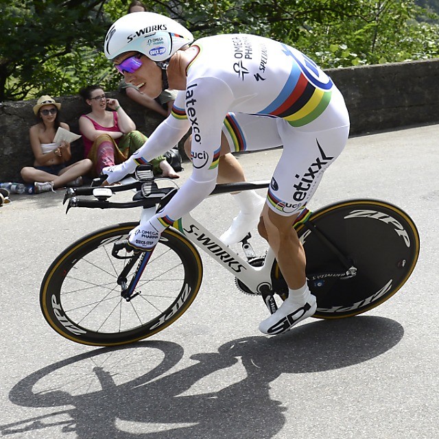 Tony Martin, der deutsche Weltmeister im Zeitfahren, gewinnt das Prolog-Zeitfahren zur Tour de Suisse in Bellinzona. Knapp neben das Podest fährt Fabian Cancellara als Vierter.