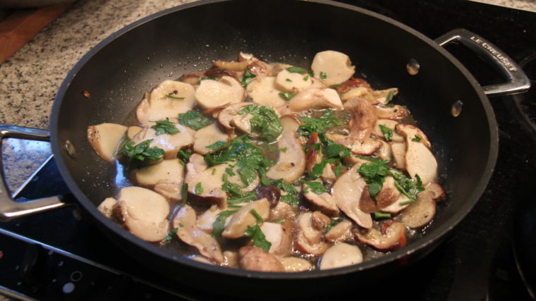 Pro Person zwei mittelgrosse Steinpilze wie oben beschrieben vorbereiten und in feine Scheiben schneiden. In einer Bratpfanne reichlich Olivenöl erhitzen und die Pilzscheiben auf mittlerem Feuer andünsten. Zwei gepresste Knoblauchzehen beigeben, kurz mitdünsten. Einen Deziliter Wasser dazugiessen und alles auf kleinem Feuer ca. 5 Minuten köcheln lassen. Die Pilze sollten noch knapp bissfest sein, dürfen aber nicht zerfallen. Mit gehacktem, flachblättrigem Peterli bestreuen. Mit grobem Salz (fleur de sel) würzen und sofort servieren. Die Steinpilze eignen sich als Vorspeise mit frischem Brot oder als Hauptgang mit einem Risotto.