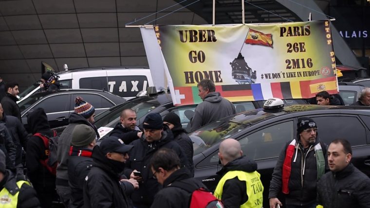 «Ich bin Taxi» und «Macron und Uber sind Komplizen», riefen die Taxifahrer mit Verweis auf Wirtschaftsminister Emmanuel Macron und den US-Fahrdienstanbieter Uber. Rund 1500 Taxifahrer hatten sich im Grossraum Paris unter anderem an den Flughäfen und an der westlichen Porte Maillot zu Protesten eingefunden.