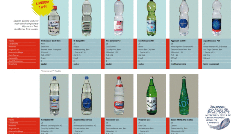 Die Mineralwasserbranche sprudelt vor Ärger: Die Vereinigung Ärztinnen und Ärzte für Umweltschutz (AefU) und die Umweltorganisation Pingwin Planet untersuchten zehn kohlensäurehaltige Mineralwassermarken in zwei Labors in der Westschweiz. Die Hälfte davon enthielt hormonaktive und neurotoxische Substanzen, wie die Organisationen am Donnerstag mitteilten. Diese Substanzen würden sich im Menschen anreichern und ähnlich wirken wie künstliche Hormone.