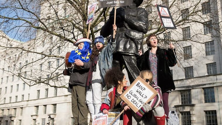 Sie forderten von May, ihre Einladung an Trump zu einem Staatsbesuch zurückzuziehen, und nannten seine Einreisebeschränkungen in die USA «rassistisch». Der friedliche Protestzug am Nachmittag begann an der US-Botschaft und endete in der Downing Street Nr. 10.