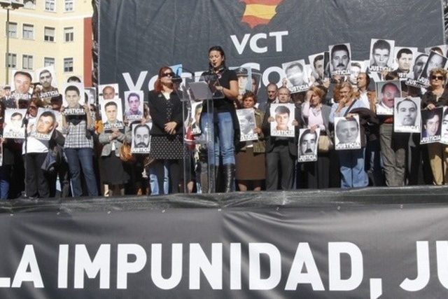 „Mörder“ und „Gerechtigkeit“ riefen die Teilnehmer am Samstag auf der Plaza de la Republica Dominicana, wo im Juli 1986 bei einem der blutigsten ETA-Anschläge zwölf Polizisten getötet worden waren.