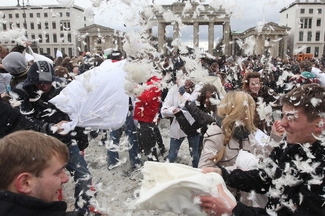 Am Brandenburger Tor in Berlin versammelten sich Hunderte nach einem Aufruf in sozialen Netzwerken wie Facebook und hauten sich die Kissen um die Ohren. Die Stadtreinigung fegte Unmengen an Daunen zusammen.