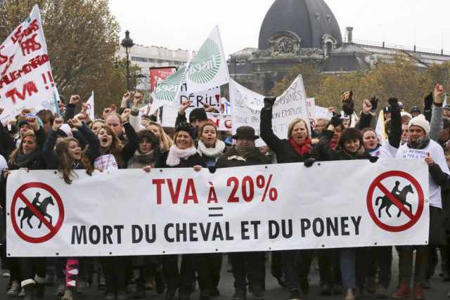 Tausende Reiter sind am Sonntag in Paris mit Ponys gegen die geplante Erhöhung der Mehrwertsteuer ab Januar aufmarschiert. Ihr Protestzug richtete sich gegen ein Regierungsdekret vom 13. November für eine höhere Abgabe auf alle Reitaktivitäten.
