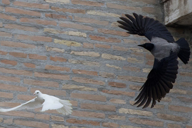 Zwei Kinder einer katholischen Organisation, die sich am Sonntag beim Angelus-Gebet am Fenster des Apostolischen Palasts an der Seite des Papstes gezeigt hatten, liessen zwei weisse «Friedenstauben» fliegen. Wenige Sekunden später wurden die Tauben vor den Augen der Gläubigen von einer Möwe und einer Krähe angegriffen und zu Tode gehackt. Die Bilder der Attacke auf die Papst-Tauben haben seither zahlreiche italienische und internationale Medien veröffentlicht.